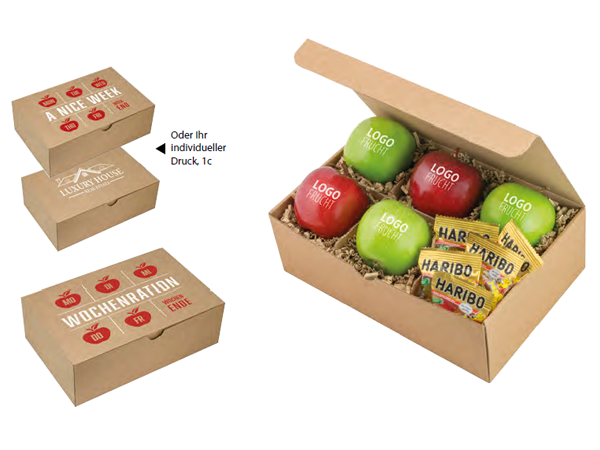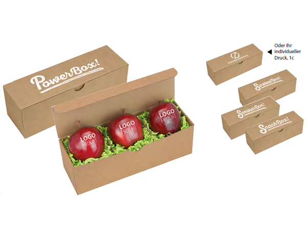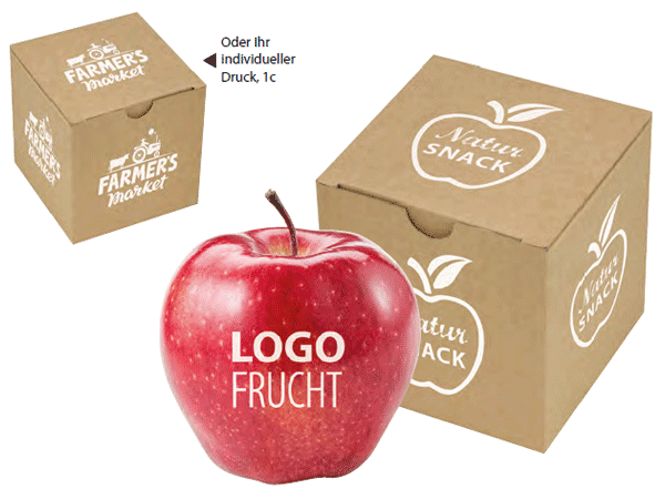 Die bedruckten Werbe-Äpfel werden in einer neutralen Box verpackt. Individuelle Motive möglich, Preise auf Anfrage.